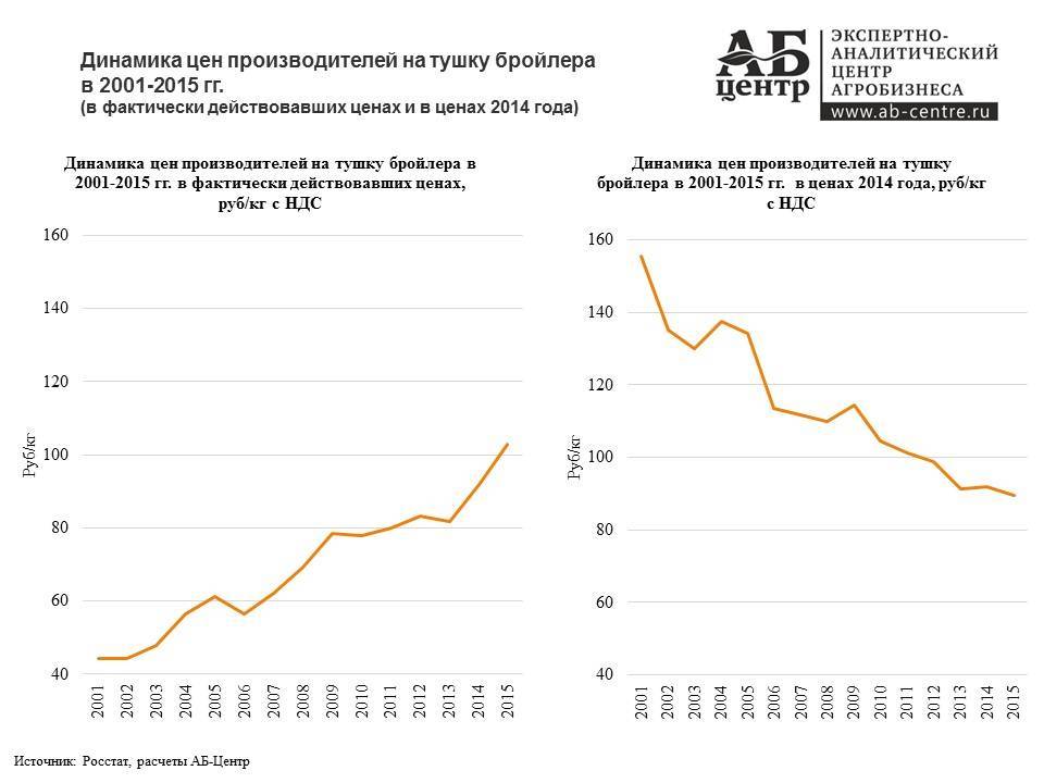 На фоне сокращения объемов потребления мяса в целом, растет потребление мяса птицы. В 2015 году потребление на душу населения достигло 31,1 кг против 31,3 кг в 2014 году, 24,6 кг в 2010 году, 18,9 кг в 2005 году. Прирост потребления сопровождался ослаблением цен производителей на данный вид мяса. В фактически действовавших ценах наблюдалось их усиление, однако рост цен был значительно ниже уровня инфляции.
