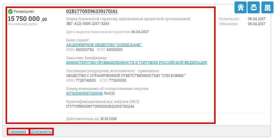 Сведения о выданной БГ размещенной в реестре выглядят следующим образом. В записи указана сумма, на которую выдана гарантия, реестровый номер записи, номер гарантии, присвоенный кредитной организацией, дата выдачи, сведения о банке, заказчике и поставщике, номер извещения, ИКЗ и срок до которого действительна БГ.