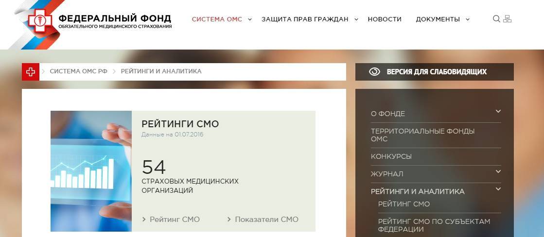 В разделе «Рейтинг СМО» посмотреть непосредственно таблицу рейтингов по более чем 29 параметрам. Есть возможность выбрать ограничение по вашей области и тогда рейтинг компаний будет выводиться только по вашему региону.