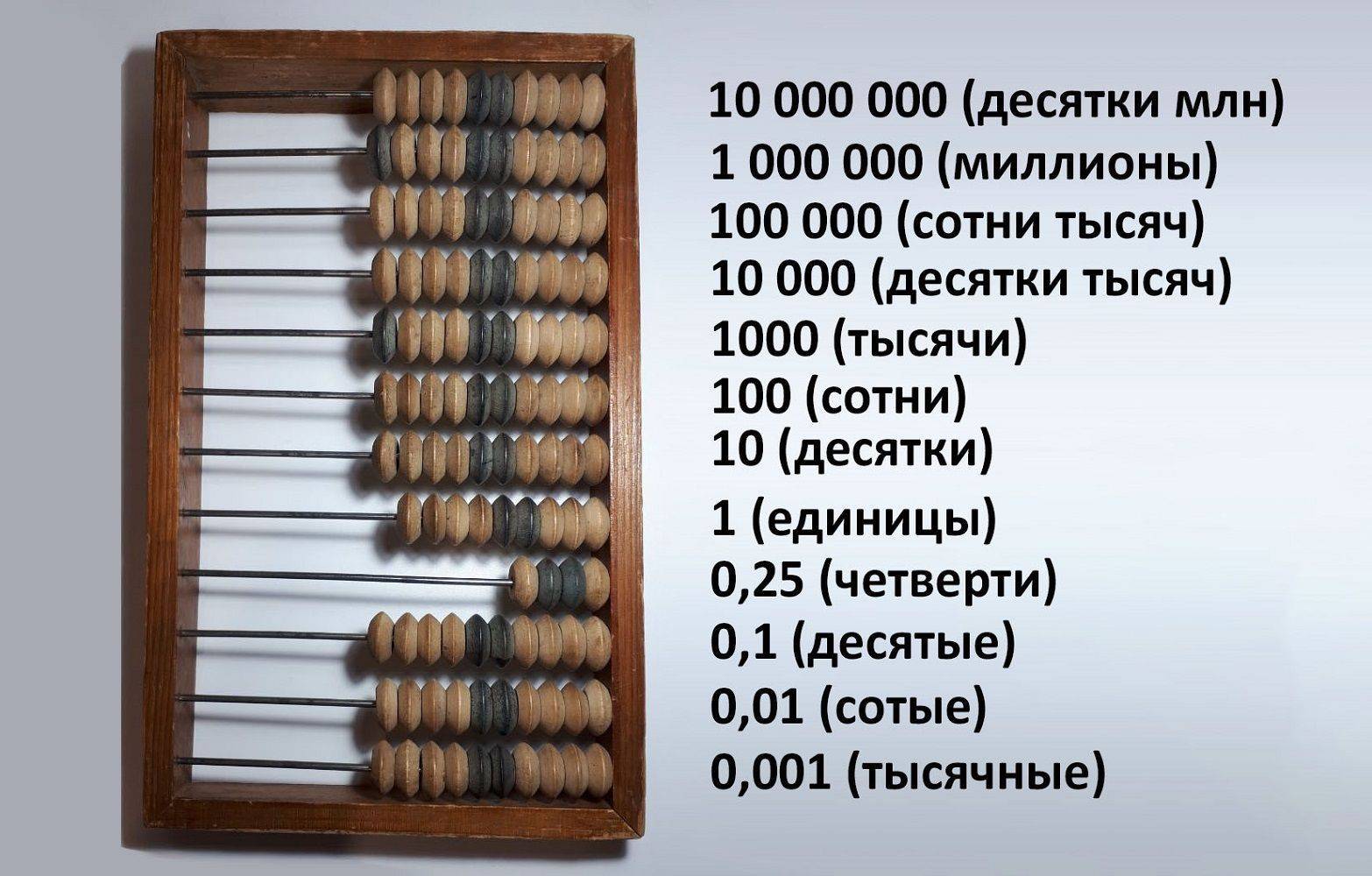 - выше снова расположены несколько рядов по десять костяшек: это единицы, десятки, сотни, тысячи и т.д.