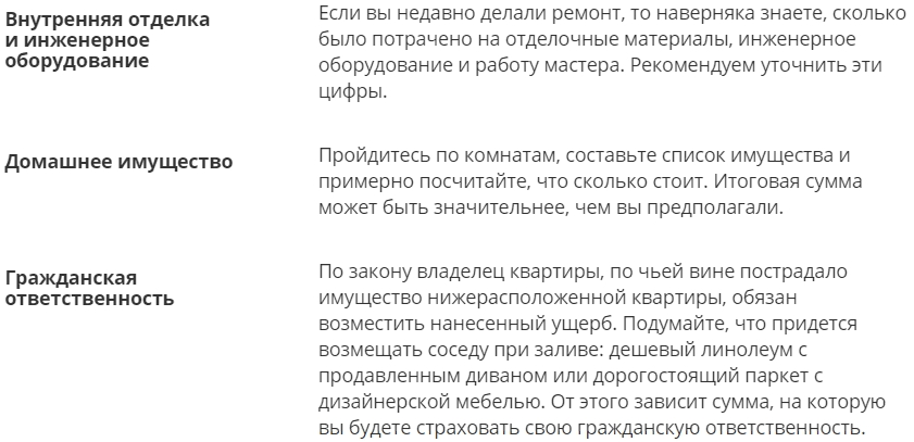 - какие элементы войдут в страховой договор – внутренняя отделка, внешняя, гражданская ответственность, имущество внутри квартиры, его стоимость.