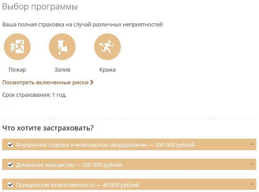 Кликните по значку рядом со списком, чтобы выбрать сумму покрытия. Для внутренней отделки доступны 3 варианта: 300 тыс., 450 тыс. и 900 тыс. рублей.