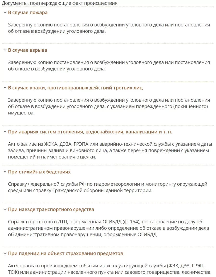 - документы, в которых отражен факт происшествия. Если был залив, то нужно получить из ЖЭКА или другой жилищной службы акт о заливе. В нем указывают, когда и по какой причине произошло затопление, а также причастное к этому происшествию лицо. К акту прикладывают список повреждений. В случае взрыва, пожара, кражи – копию постановления о возбуждении (отказе в возбуждении) уголовного дела. Если на застрахованный объект наехал транспорт, необходимо запросить справку о ДТП (форма 154), постановление о возбуждении или отказе в возбуждении дела об административном правонарушении;