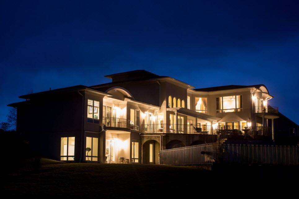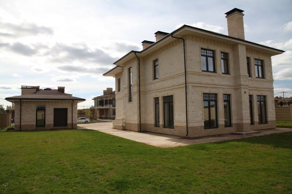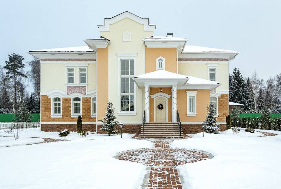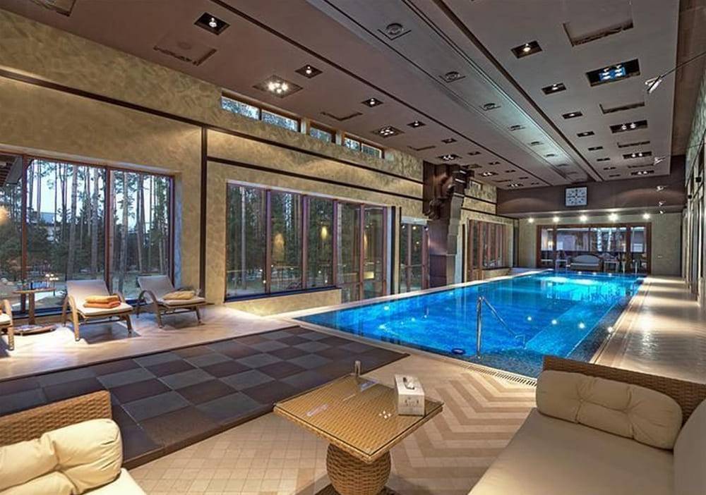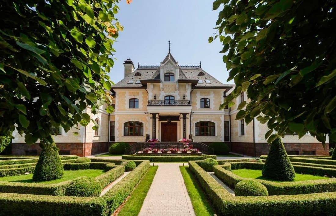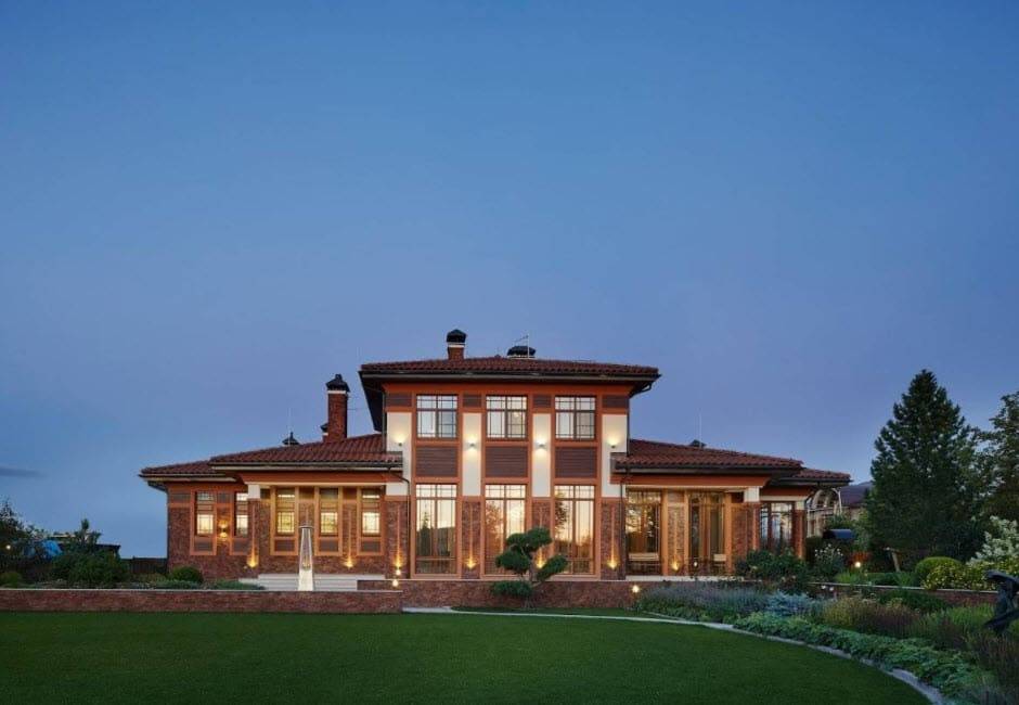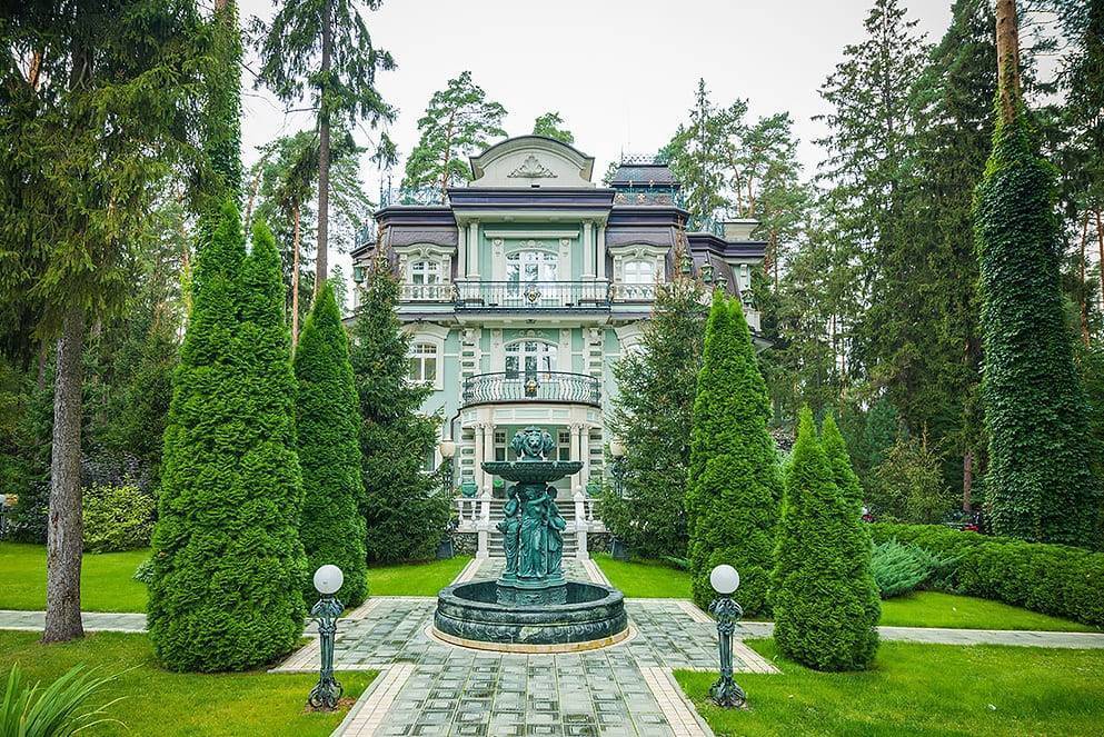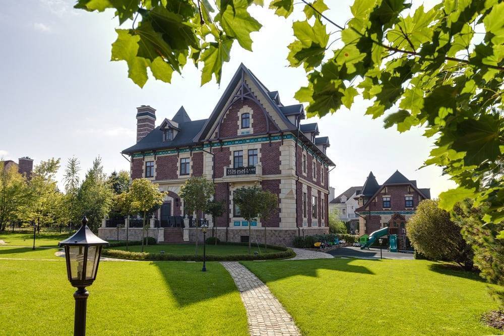 Отделка здания была произведена клинкерным кирпичом, есть теннисный корт, живописные фонтаны, которым зима нипочем, а также рукотворный пруд. Интерьер — многими уважаемая классика. Тот же спортзал и спа, хороший гараж, сауна и кинозал. Выше несколько спален, гостиная, мансарда.