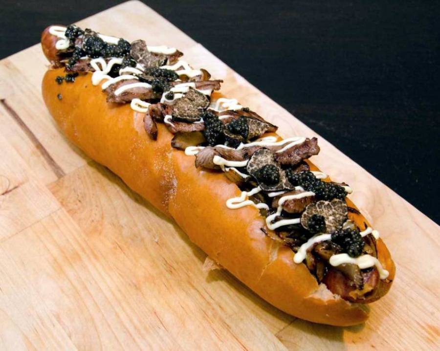 Чтобы съесть этот хот-дог с заправленным в него куском копченого сыра, кусочками тонко нарезанной говядины Wagyu, маслом терияки, жареным луком, грибами майкаке, фуа-грой, бритыми черными трюфелями, икрой Paddlefish и японским майонезом, надо заказать его заранее (за две недели вперед), а затем наслаждаться его вкусом, зная, что ваши деньги пойдут в фонд Американского Красного креста.