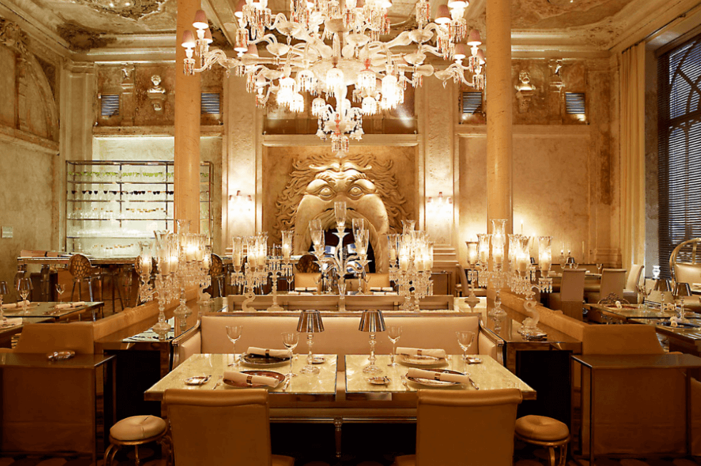 Cамый дорогой ресторан Петербурга, расположенный Строгановском дворце: одном из самых старинных зданий. Каждый зал ресторана оформлен в определенном стиле, присущем только ему: пышное роккоко, легкомысленное барокко, строгий классицизм. На столах можно увидеть эксклюзивный фарфор (точная копия посуды графа Строганова), богемский хрусталь, позолоченные столовые приборы.