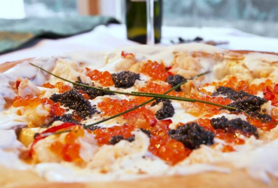 Эта пицца готовится исключительно в присутствии клиента, и для ее начинки используется мясо буйвола, моцарелла, красный королевский лобстер, три вида икры, омары и креветки.