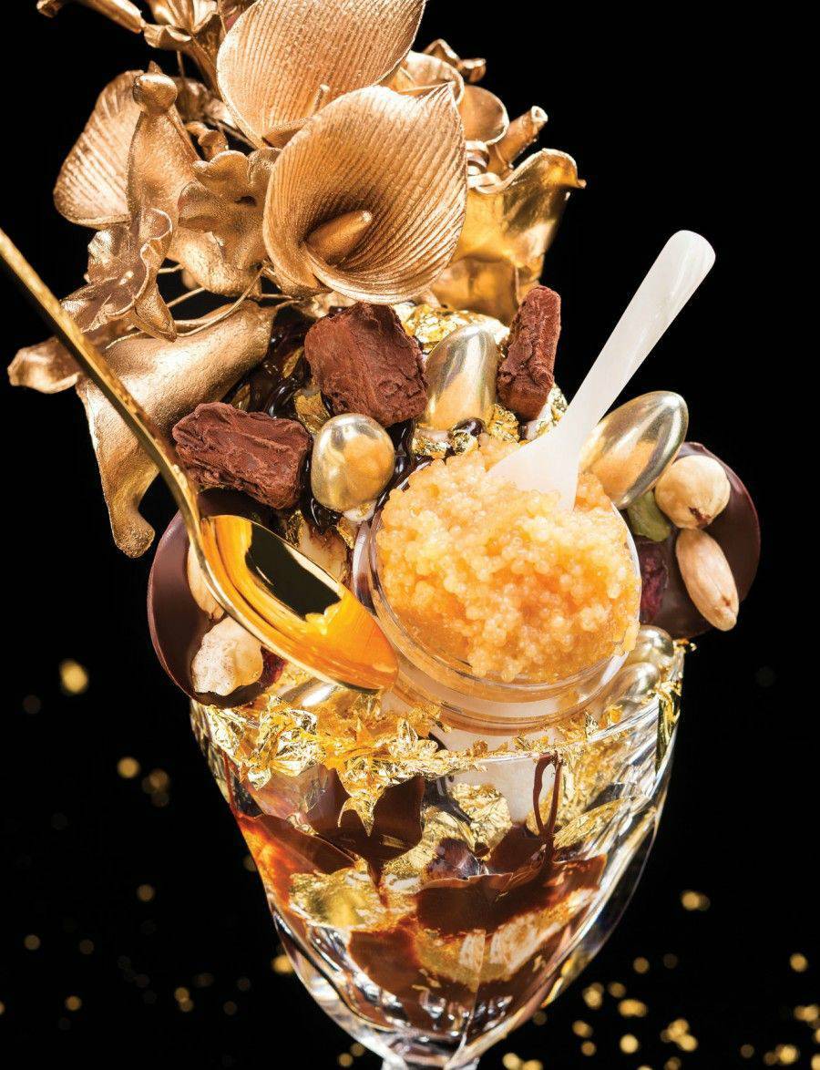 Те, кто пробовал его, говорят о его изумительном вкусе. А как же ему (мороженому) не быть изумительным, ведь оно содержит в себе таитянское ванильное мороженое, наполненное ванилью из Мадагаскара, покрыто 24-каратным (съедобным) золотым листом и содержит шоколад Amedei Porcelana, сироп и кусочки шоколада Chuao из Венесуэлы. А засахаренные фрукты из Парижа, позолоченный миндаль, трюфели (не путать шоколад с грибами) и марципановые вишни украшают его сверху, и все это подается в кубке из хрусталя Баккара, который вы можете взять домой после того как съедите все мороженое.