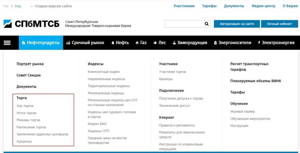 В расположенном слева меню в каждой из секций имеется пункт «Торги», который с некоторыми вариациями содержит примерно одинаковые подпункты: