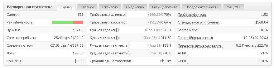 Средняя прибыль примерно равна средним убыткам и составляет около 26 пунктов. Количество прибыльных сделок составляет около 67%, а профит-фактор составляет 1.52. Торговля ведется только по паре EURUSD.