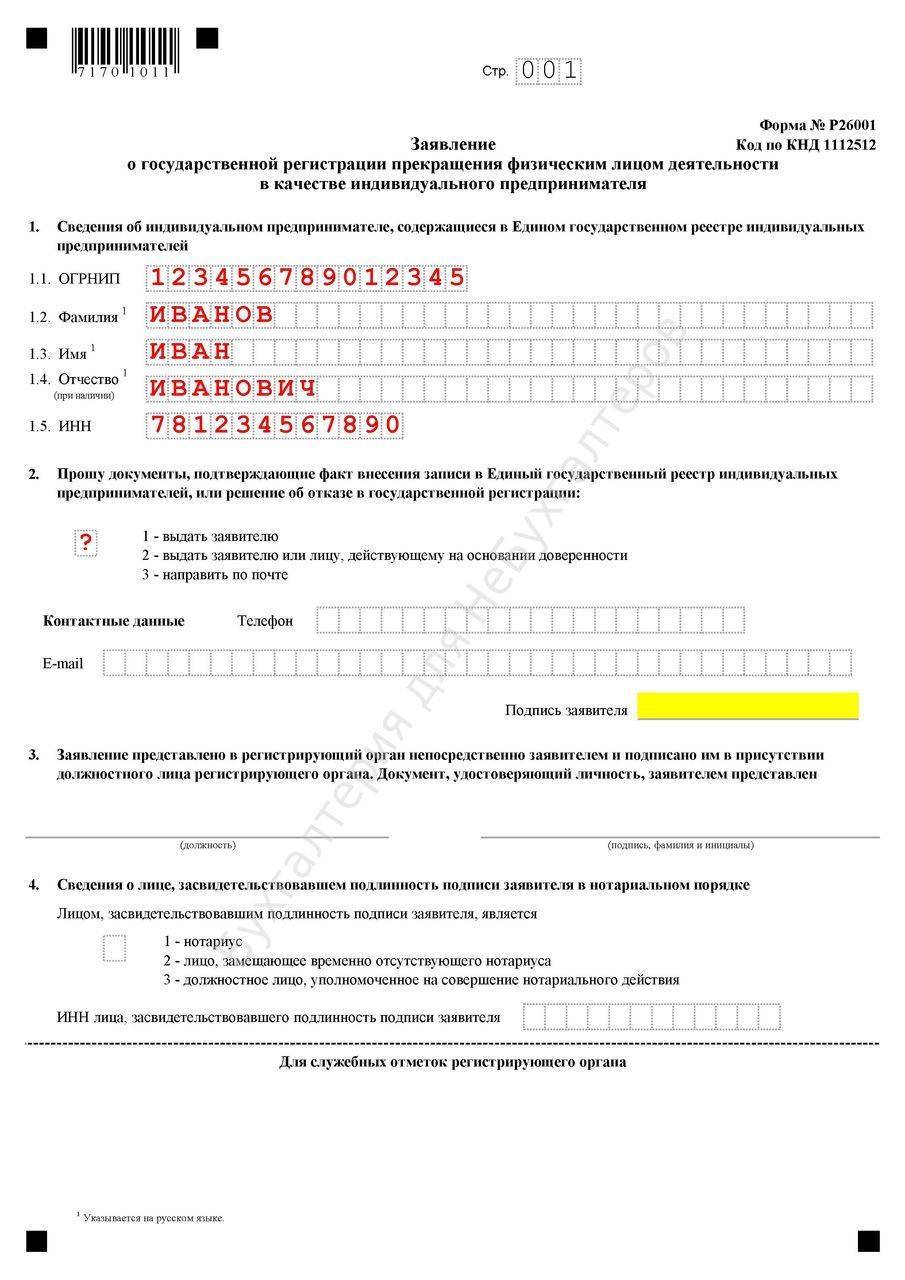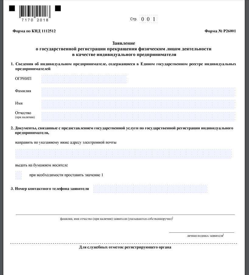 - Заявление на закрытие ИП по форме (заявление о прекращении деятельности в качестве ИП по форме Р26001);
