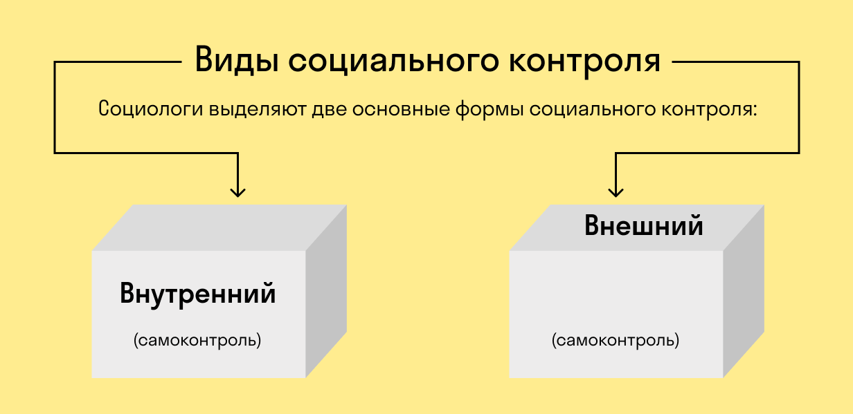 В связи с этим выделяют внешний социальный контроль и внутренний социальный контроль, или самоконтроль.