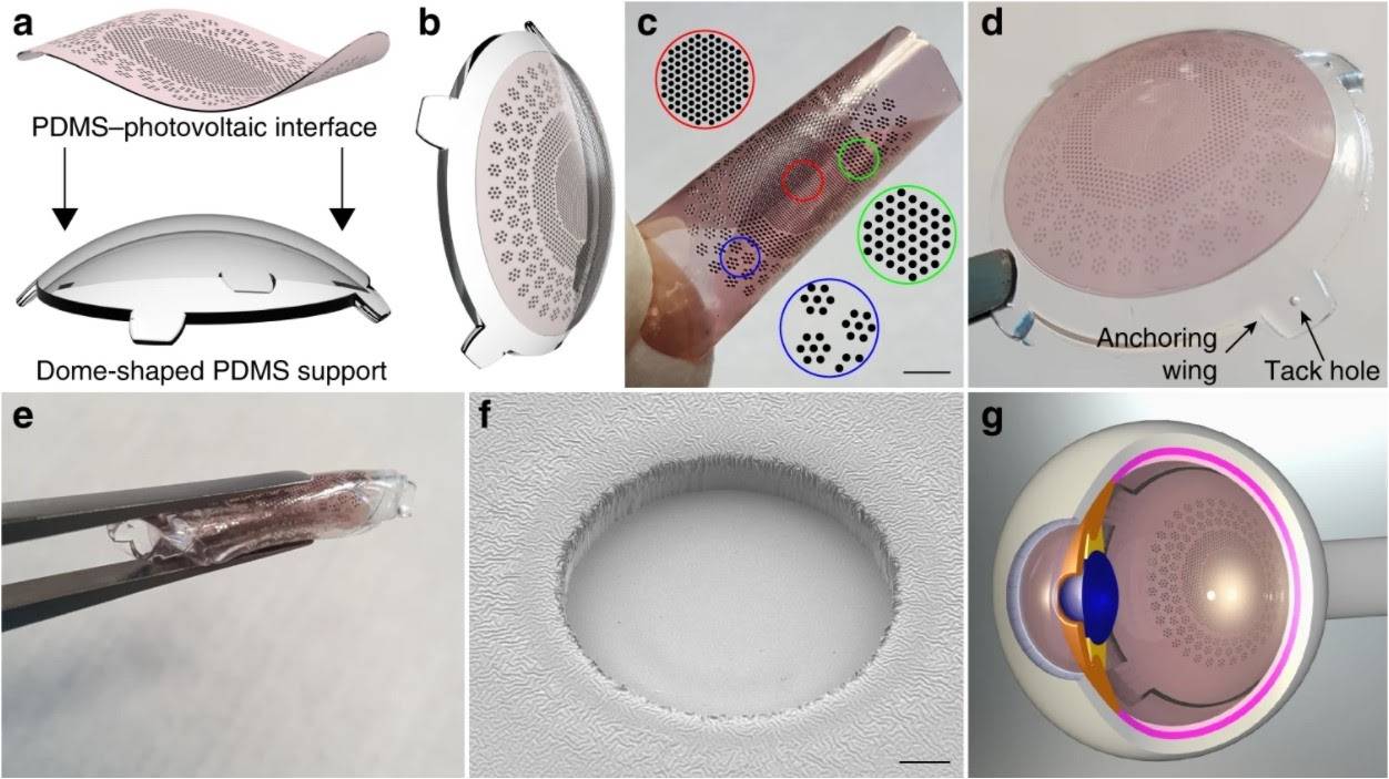 В Polyretina используется маленькая пленка, покрытая слоем химического вещества, которое имеет свойство поглощать свет и конвертировать его в электрический сигнал. Пленка размещена на сферическом основании, чтобы можно было удобно разместить ее на глазном дне.