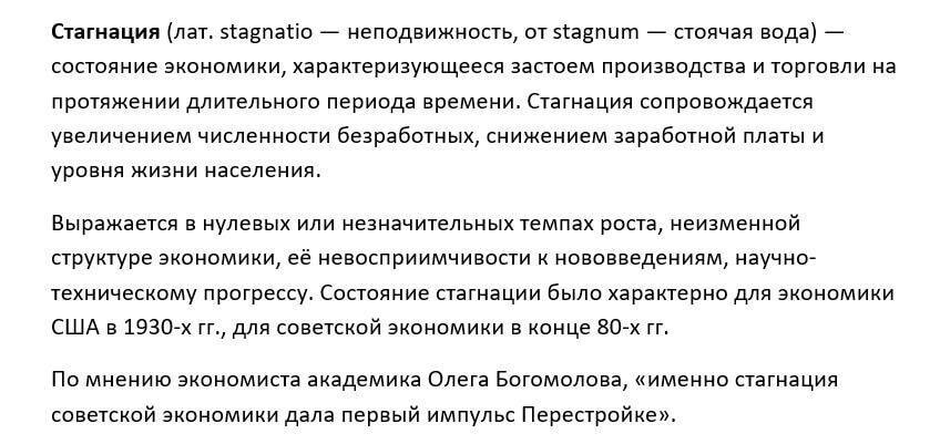 Стагнацию можно было наблюдать в 20е годы в США (перед Великой Депрессией 1929-1933 гг) и в конце 80х годов в СССР.