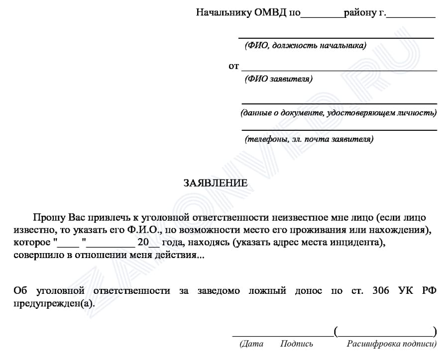 - Формулировка просьбы о проведении проверки и привлечении к ответственности виновных. Лицо также должно указать, что осведомлено об ответственности по 306 статье УК РФ (заведомо ложный донос).