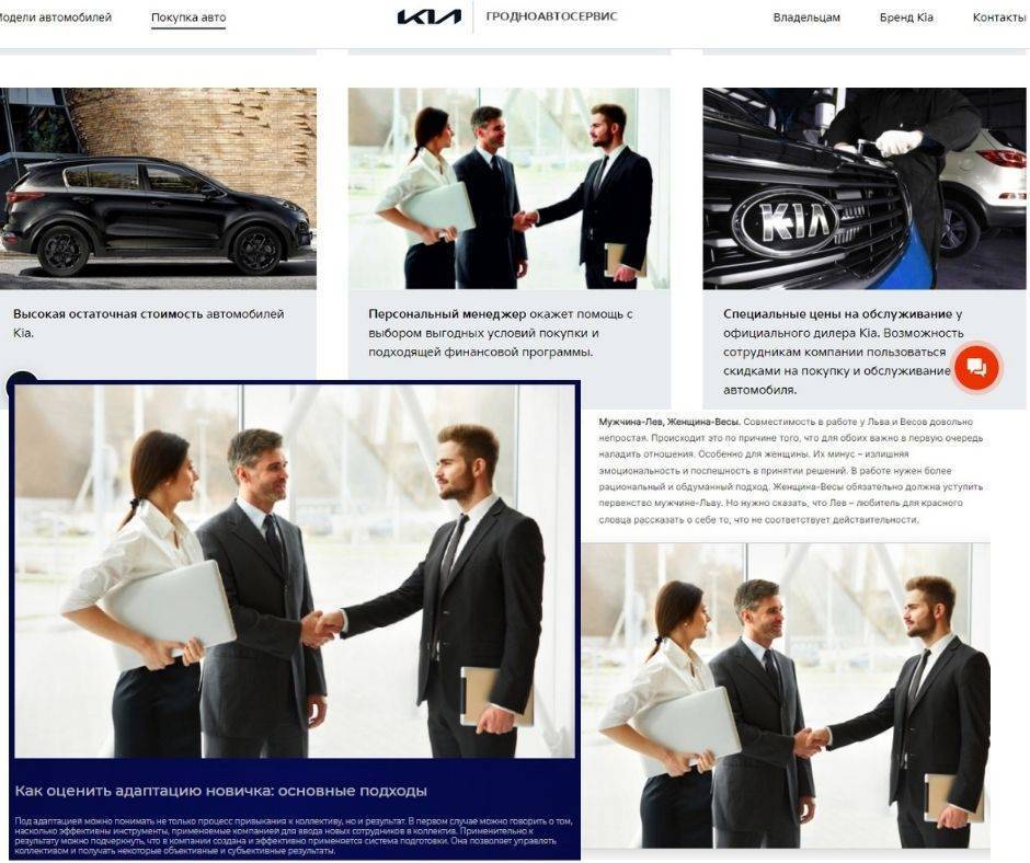 Иллюстрация под этим абзацем аккумулирует в себе многие недостатки. Она слишком идеальная, неестественная и скучная. Как видите, одной и той же фотографией проиллюстрированы статьи про адаптацию новичков на работе и про совместимость гороскопов, а еще она размещена на лендинге автосалона.