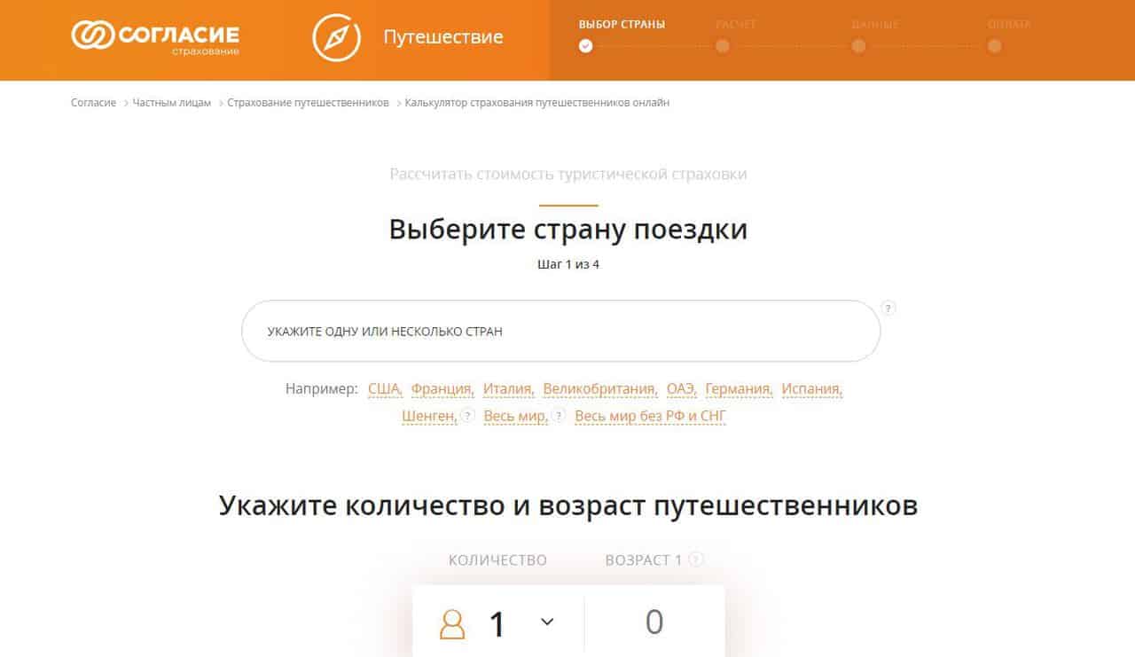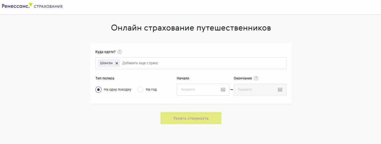 Пример формы, которую нужно заполнить, чтобы получить варианты страхового полиса. Указываешь страну, даты поездки и возраст путешественников. Всё просто.