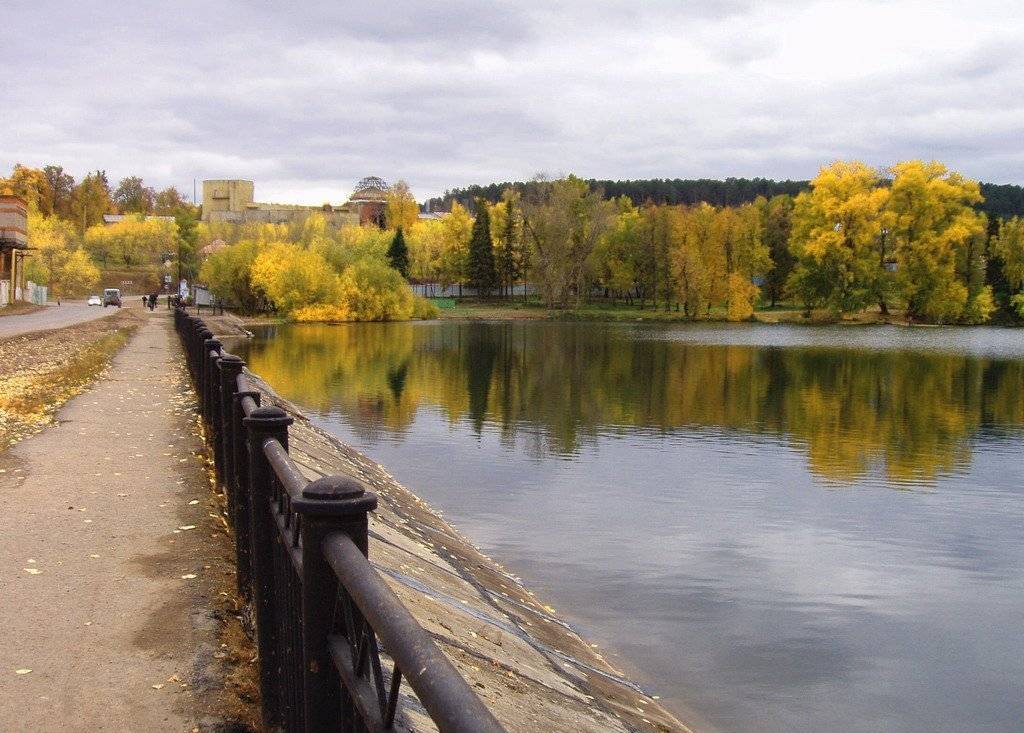 Плотина Суксунского пруда живописна. По ней можно и нужно прогуляться – есть тротуар. На одном конце плотины находятся парки и проходные завода. На другом конце, на горе, – церковь Петра и Павла.