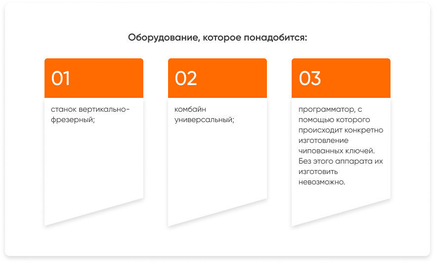 Цены на оборудования в этом бизнесе порядком ниже, чем в остальных производственных сферах. Далее приведен список основных инструментов для изготовления изделий. Но, например, для программирования домофонных чипов и ремонта автомобильных брелоков вам понадобится еще некоторое оборудование.
