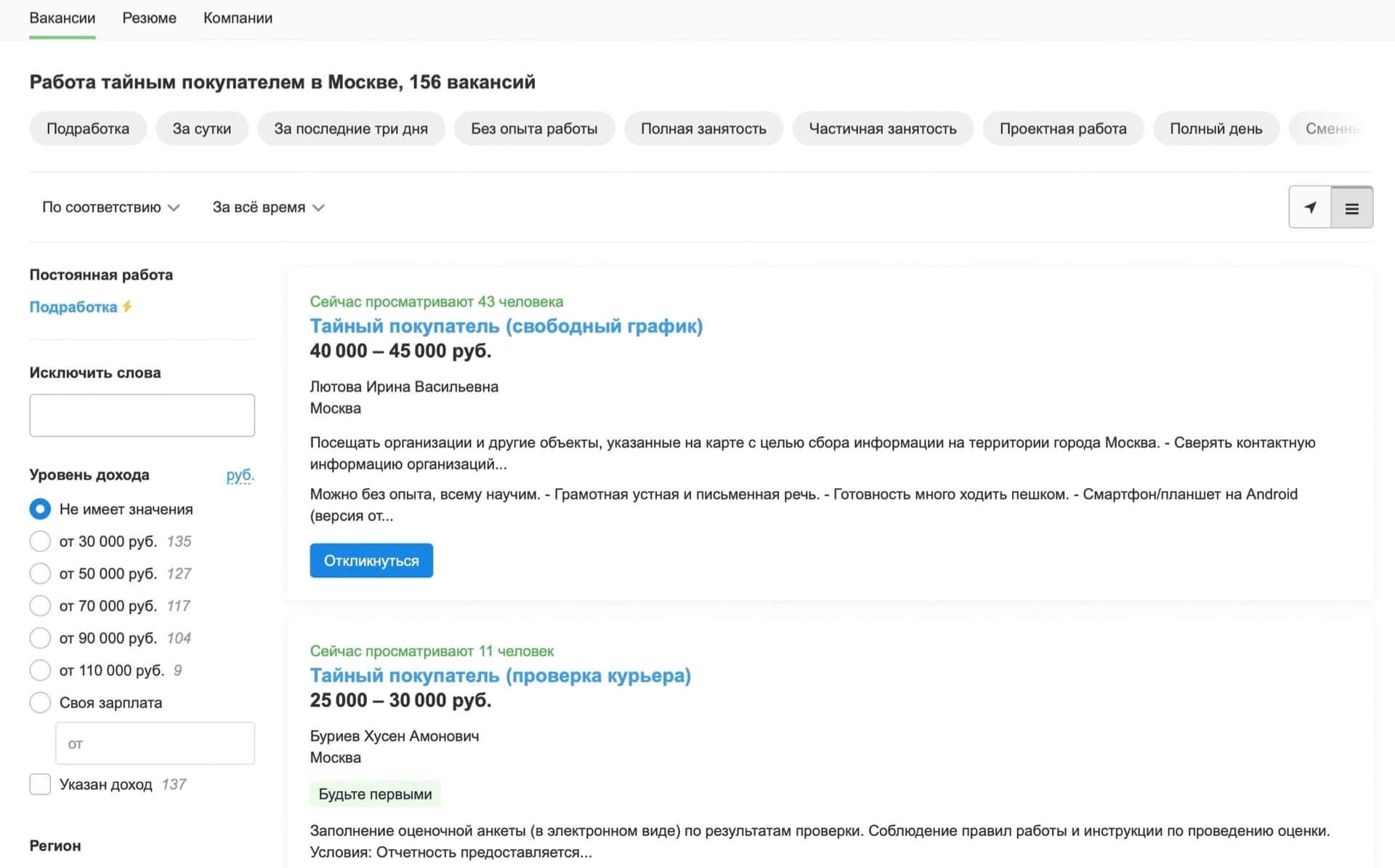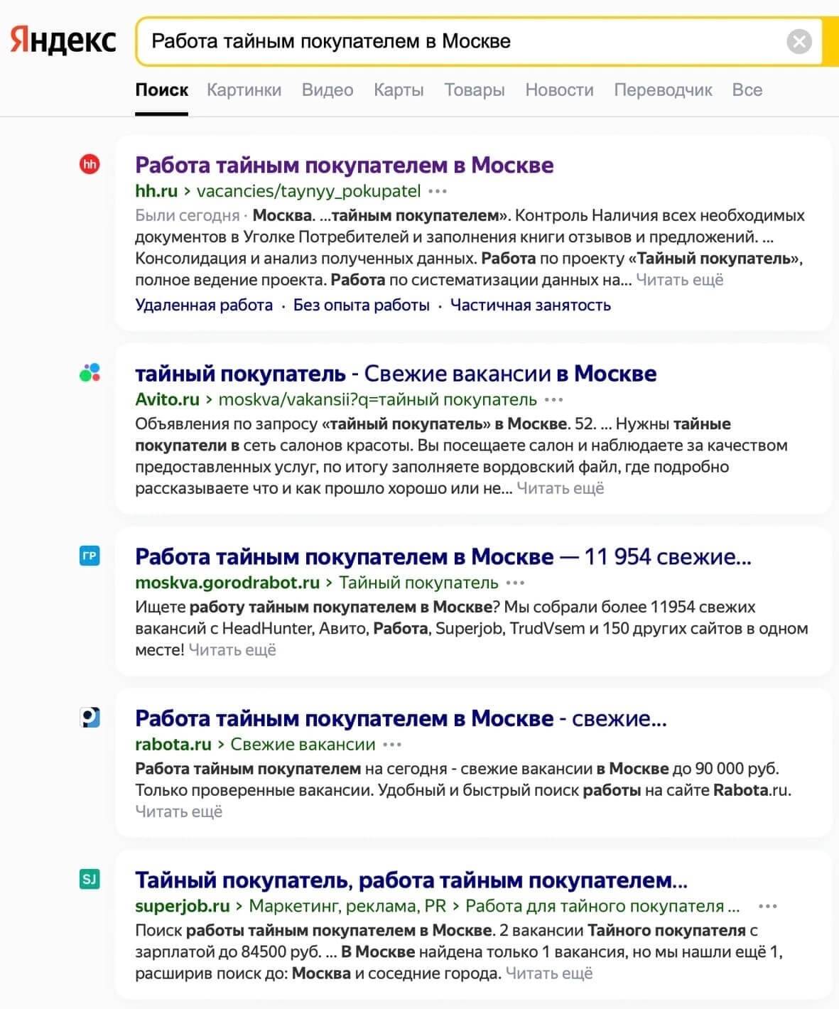 Найти объявления можно и через поисковик: достаточно набрать «работа тайным покупателем» и указать свой город. В поисковой выдаче появится много разных вариантов.