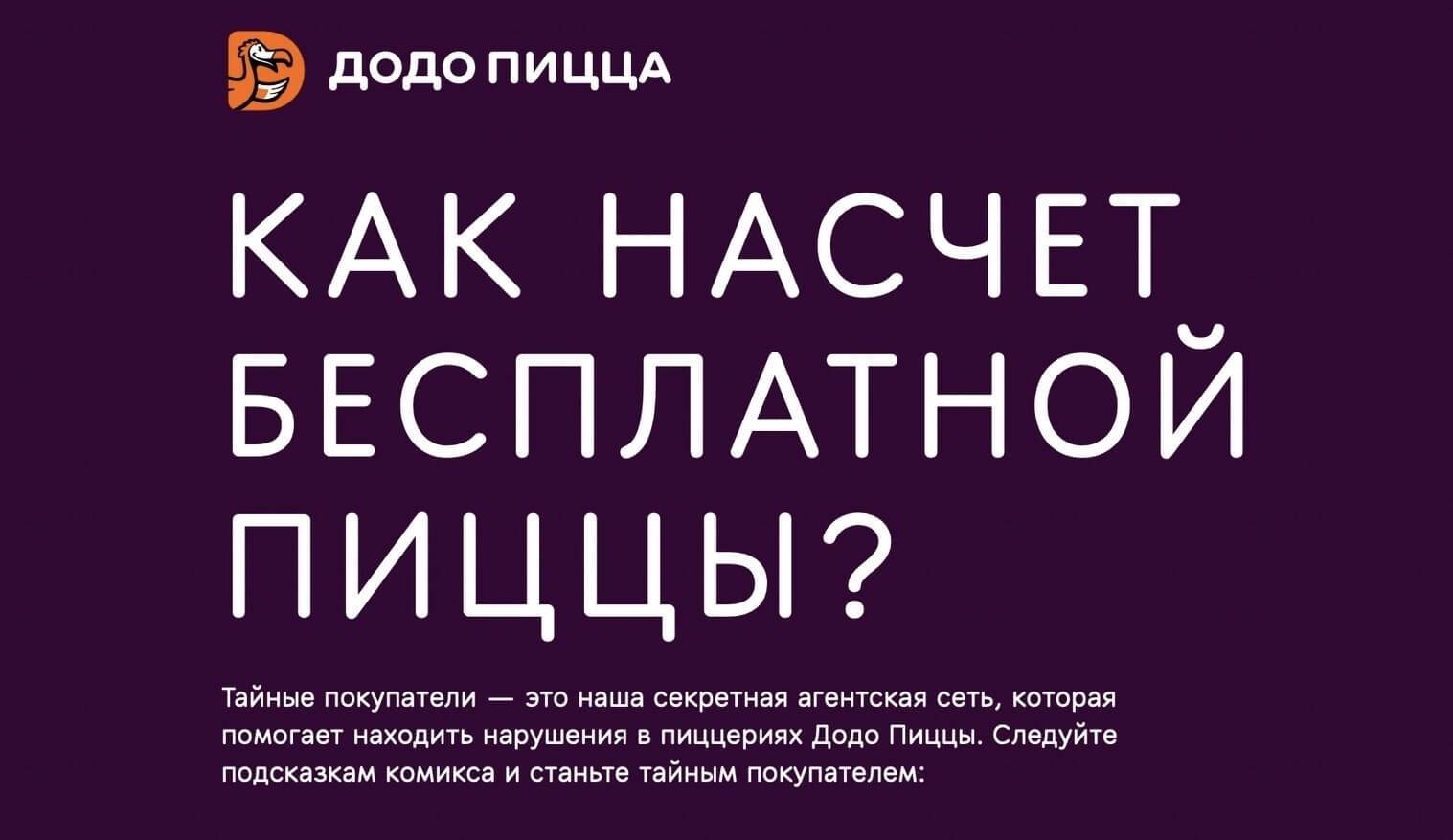 Иногда компании ищут тайных покупателей прямо на своих сайтах. У «Додо Пиццы» для этого есть отдельный раздел. Пользователям предлагают сделать заказ, сфотографировать продукт и составить отчет. За такую работу «шпионы» получают бонусы, которыми можно полностью оплатить заказ еды в пиццерии.