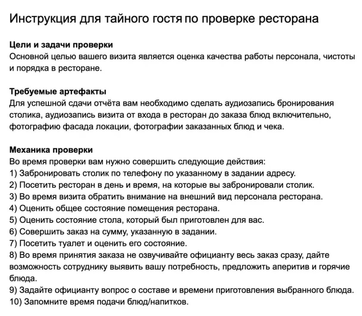 Готовую легенду и анкету передают тайному покупателю. Его задача — изучить инструкцию, действовать строго по ней и запоминать всю информацию, получаемую во время проверки.