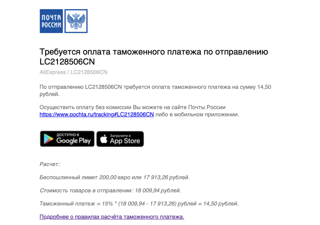 К чести Почты России, весь расчет они мне сами и прислали — решать эту задачу с калькулятором не пришлось. Более того, оплатить все получилось прямо на сайте почты. Так что зря я переживал.