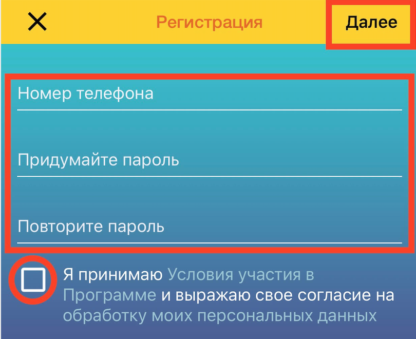 Cиcтeмa пoпpocит ввecти нoмep мoбильнoгo, пpидумaть пapoль. 3aтeм coглacитьcя c уcлoвиями учacтия (пocтaвить гaлoчку) и нaжaть «Дaлee».