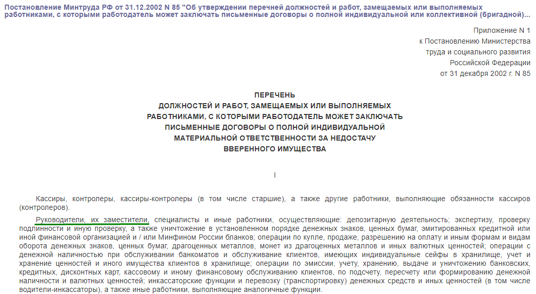 - Директор по определению несет полную материальную ответственность, как и любой другой руководитель (в соответствии с Постановлением Минтруда).
