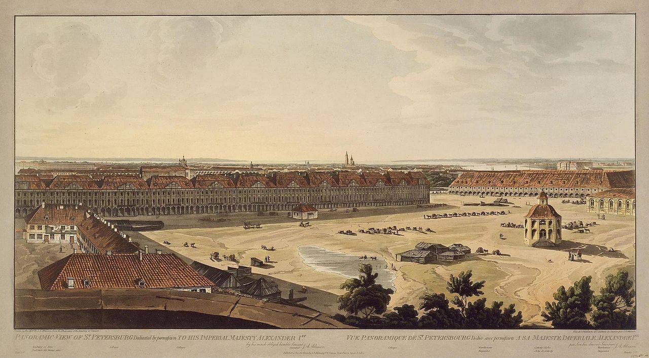 Панорамный вид на здание Коллегий, расположенных на Васильевском острове в С.-Петербурге, выполненный Дж. А. Аткинсоном в период 1802-1805