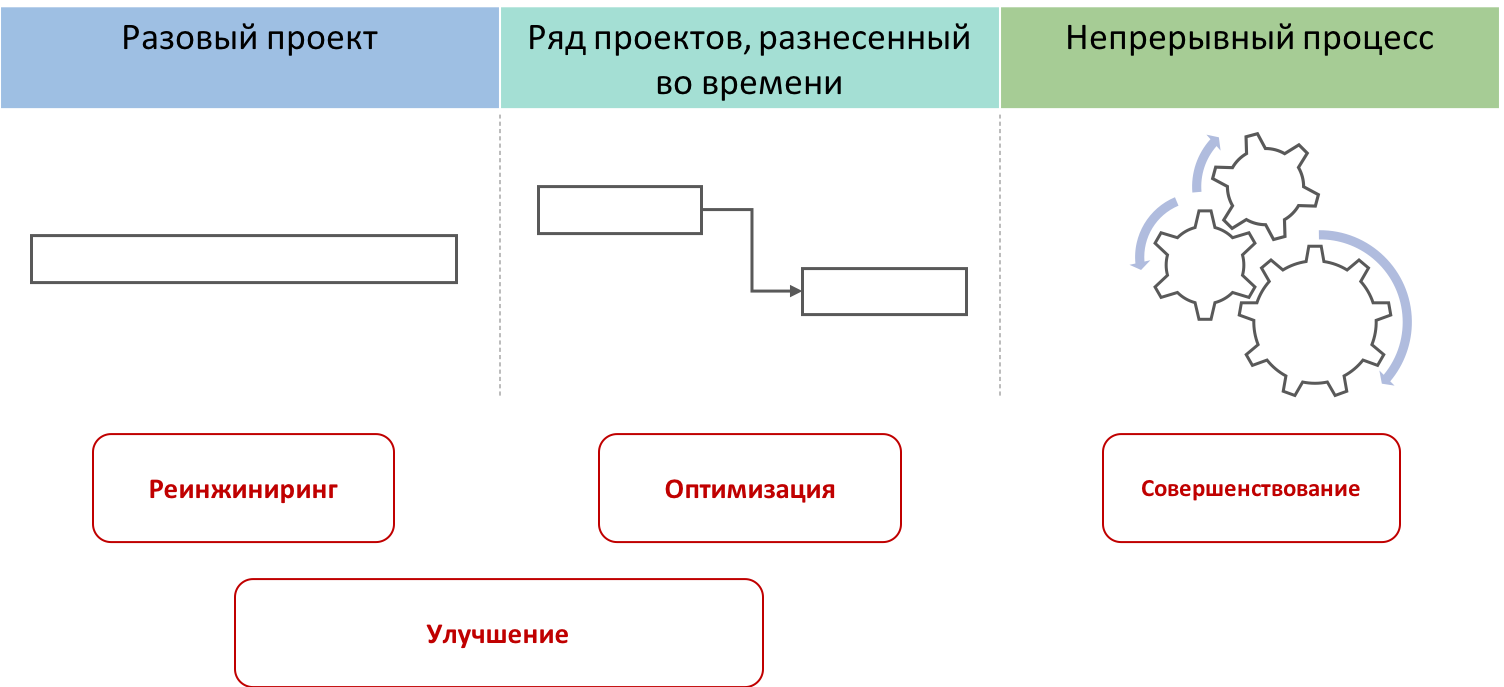 Это важно – реинжиниринг бизнес процессов всегда затрагивает процессы управления. Нельзя изменить основные или вспомогательные процессы и не изменить процессы управления. Чем сложнее мероприятие, тем реже оно происходит