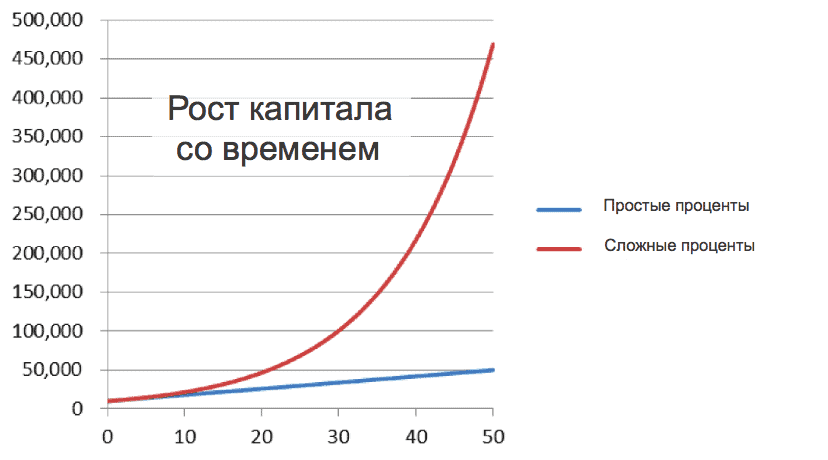 За счет правила сложного процента, капитал начинает увеличивается экспоненциально.
