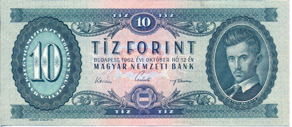 В 1946 году банкноты номиналом 10 и 100 форинтов были введены в обращение Magyar Nemzeti Bank (Венгерский национальный банк). Новая серия банкнот более высокого качества (номиналом 10, 20 и 100 форинтов) была представлена в 1947 и 1948 годах. Банкноты номиналом 50 форинтов были добавлены в 1953 году, банкноты номиналом 500 форинтов были введены в 1970 году, а затем — 1000 форинтов в 1983 году. и 5 000 форинтов в 1991 году.