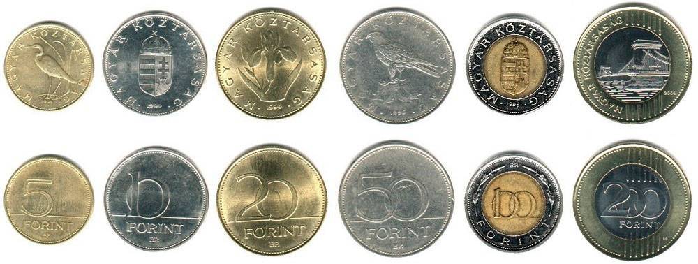 Например, аверс монеты номиналом 5 форинтов содержит изображение большой белой цапли. На 10 и 100 форинтов нанесен государственный герб Венгрии, а на 20 форинтах можно увидеть местного ириса. Монеты номиналом в 50 и 200 форинтов содержат изображения, соответственно, балобана и цепного моста в Будапеште. Реверс металлических венгерских форинтов включает цифровой номинал, а также гравировку «Forint» и окантовку по периметру в виде орнамента.