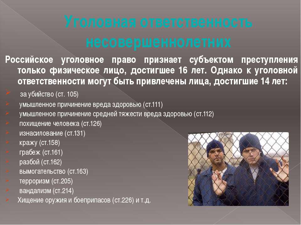 Для детей, чей возраст достиг 14-летней отметки уголовная ответственность довольно мягкая (специфика уголовного наказания несовершеннолетних). В большинстве случаев подростки будут освобождены от уголовного преследования, однако законодатель предусматривает ряд преступлений, за который подростки будут нести уголовное наказание: