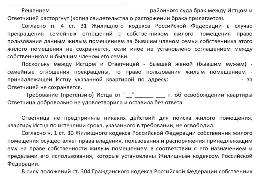 - в квартире истца против его воли проживает (не имея на то оснований) бывший супруг (супруга);