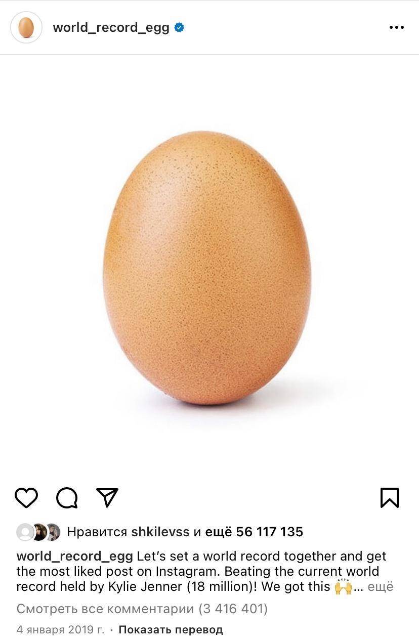 В 2019 году в «Инстаграме»* появился аккаунт @world_record_egg. В нем была всего лишь одна фотография куриного яйца с призывом побить мировой рекорд по лайкам, который на тот момент установила Кайли Дженнер. Простота и максимально легкий и даже глупый призыв сделали свое дело — 56 тысяч миллионов лайков: