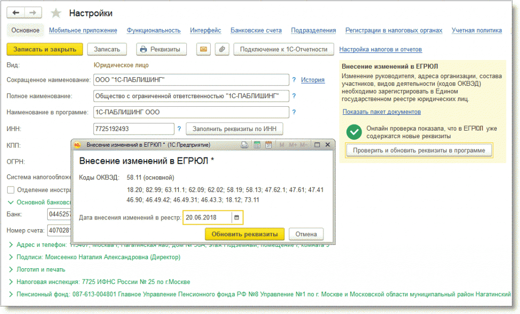 В программе «1С:Бухгалтерия 8» начиная с версии 3.0.64 появилась новая функциональная возможность, с помощью которой можно подготовить пакет документов для внесения изменений в единые государственные реестры ЕГРЮЛ и ЕГРИП: помощник Внесение изменений в ЕГРЮЛ, ЕГРИП (далее – Помощник).