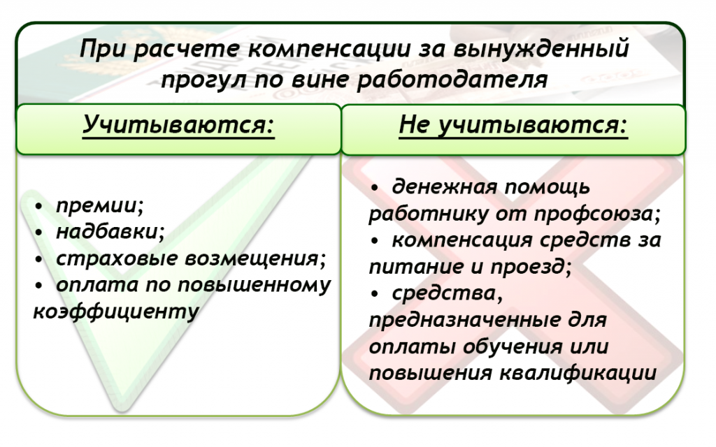 Продолжительность ВП определить крайне важно, так как для расчетов компенсаций нужно знать сроки, за которые происходят начисления. Период прогула – это время между датой увольнения (первой вынужденной неявки на работу) и датой вынесения решения правовой структурой (судом)