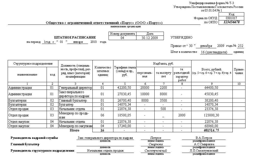 Название должностей во всех документах должно полностью совпадать. Кроме того, акт содержит все реквизиты, присвоенные штатному расписанию. В том числе не документе проставляется дата и регистрационный номер расписания.