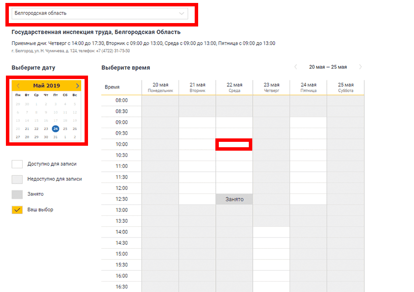 Далее откроется таблица и календарь слева. В таблице напротив времени можно увидеть серые окошки с надписью «Занято» и белые окошки. Выбрав комфортное время для посещения напротив одного из белых окошек, нужно на это окошко нажать.