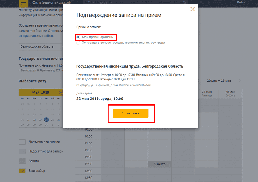 Затем система предложит выбрать одну из двух причин обращения. Выбрав пункт «Мои права нарушены», надо нажать на кнопку «Записаться».